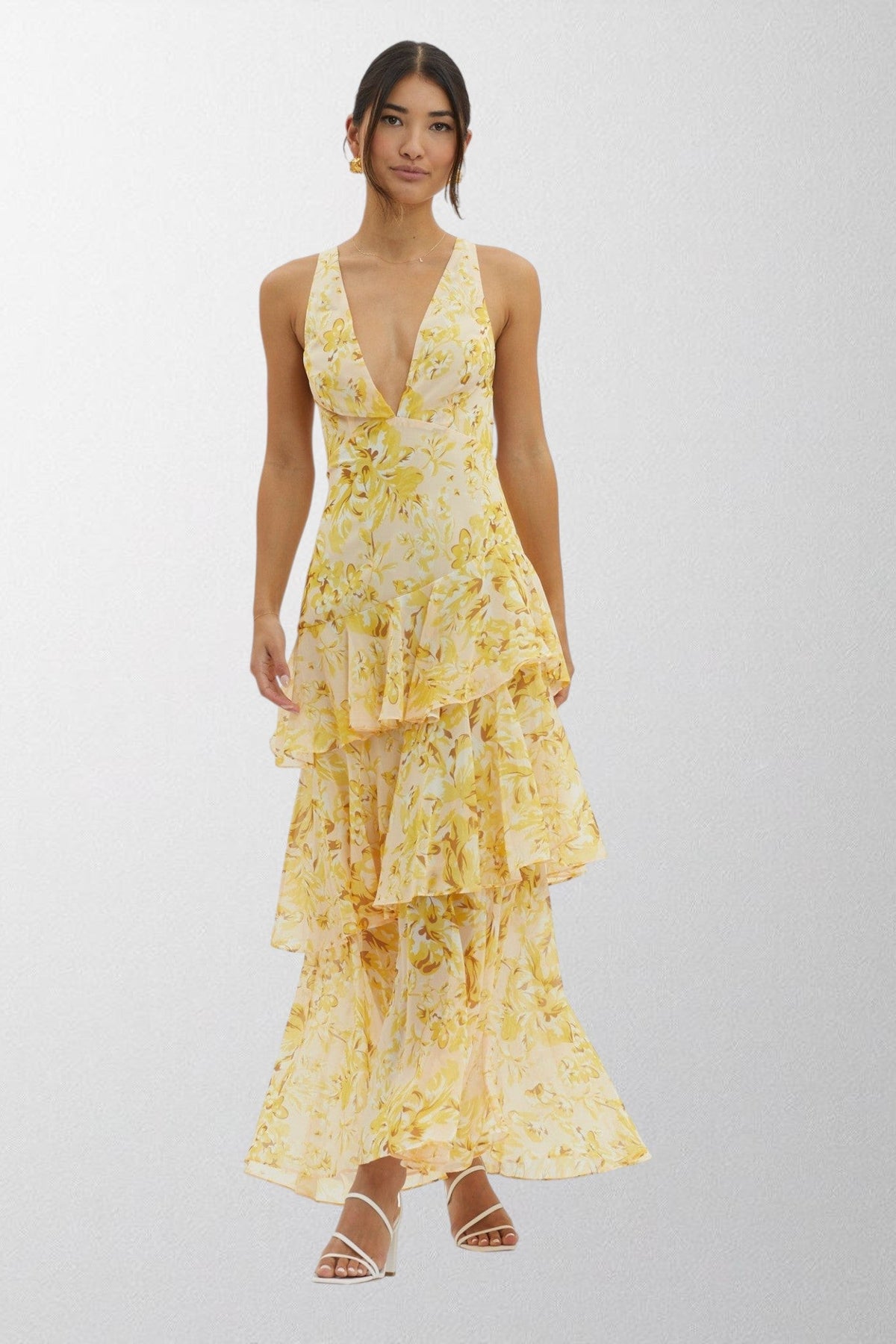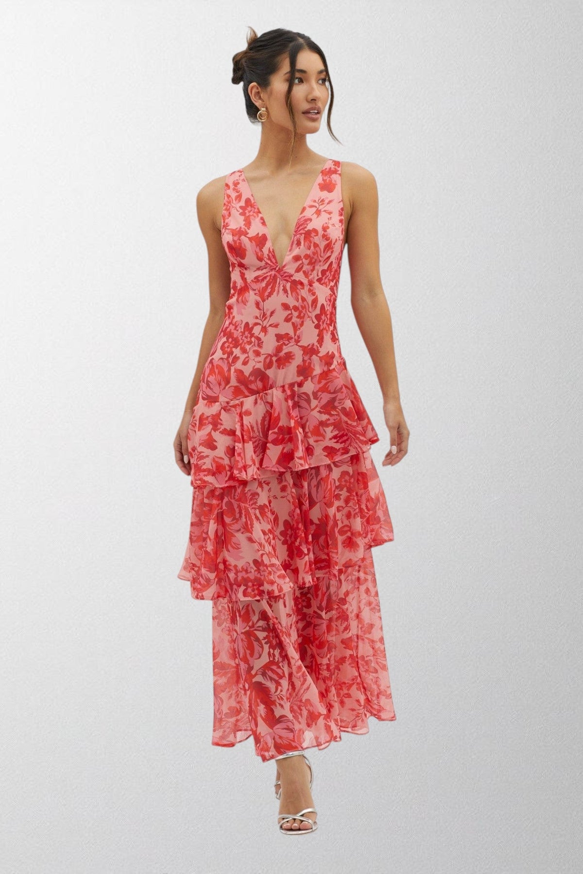 Designed to capture the beauty of blooming florals, this midi dress features a deep V-neckline and layered ruffle skirt that flows with every step. A perfect choice for garden parties, summer weddings, or chic evenings, combining freshness with timeless elegance.