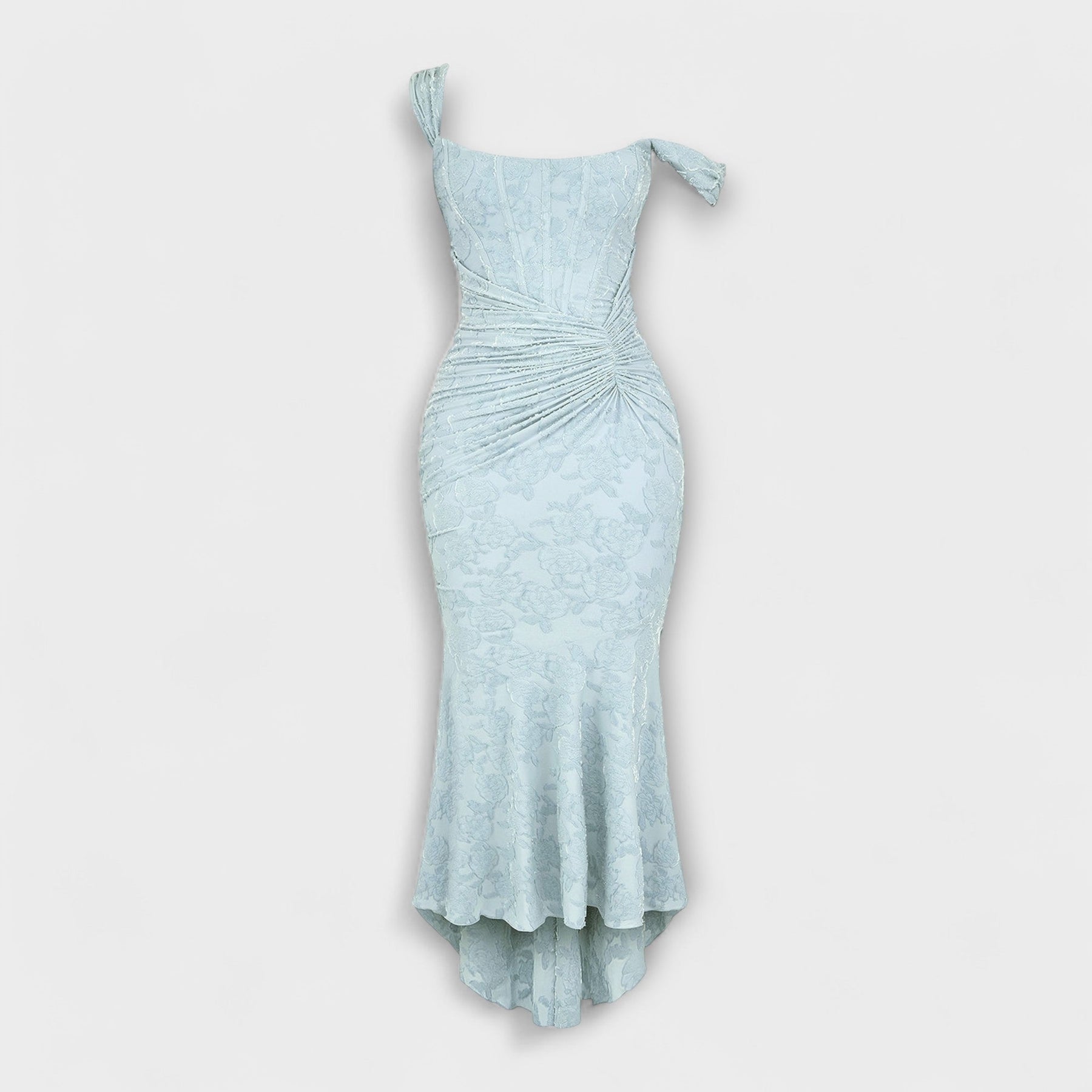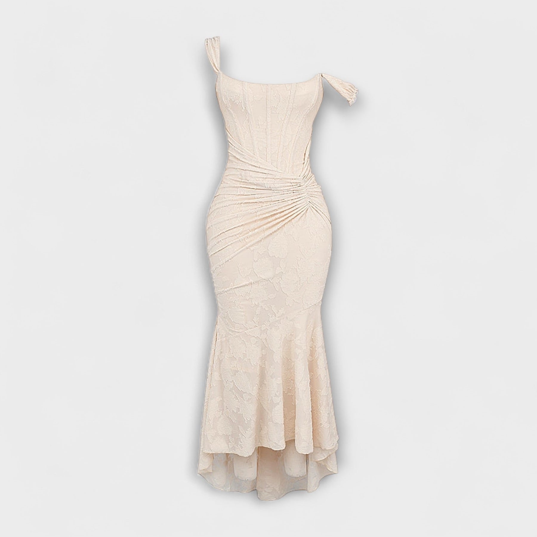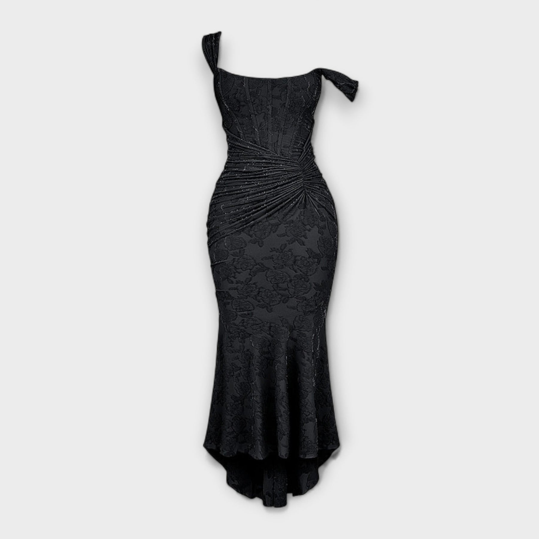 Turn heads at any occasion with this exquisitely tailored maxi dress, designed to flatter and accentuate your silhouette. Featuring a structured corset bodice and delicate draping at the waist, this gown effortlessly blends sophistication with a touch of romantic drama. The subtle high-low hem adds movement and grace, making it ideal for evening events, weddings, or special celebrations.