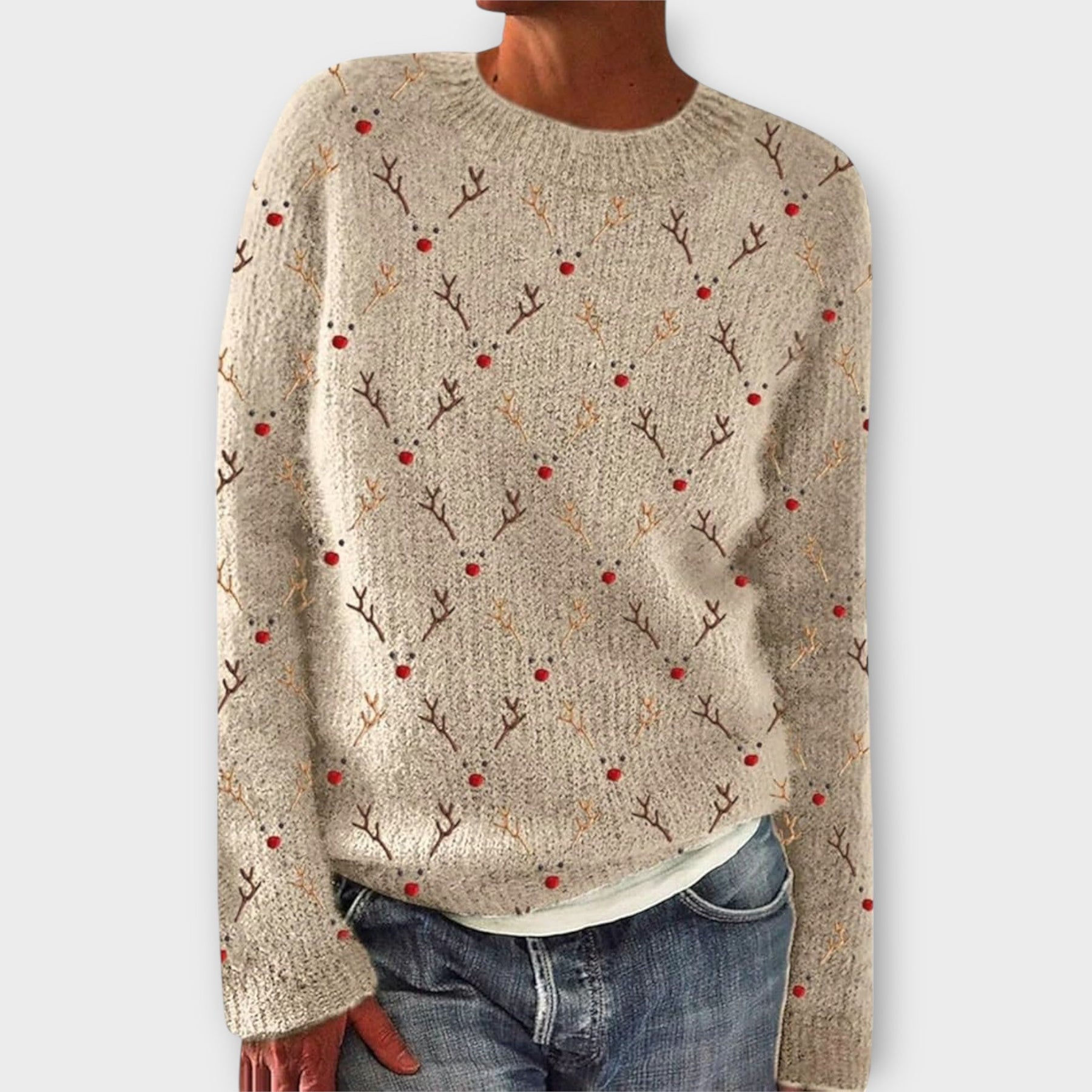 This cosy knitwear captures the essence of the festive season with its playful and elegant pattern. Perfect for embracing colder days, it offers both warmth and a cheerful touch, ideal for casual outings or relaxed celebrations.